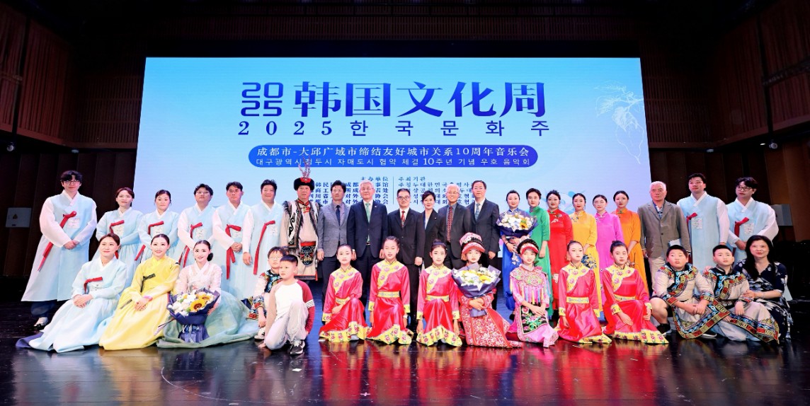 在韩国文化周开幕式暨成都市—大邱广域市缔结友好城市关系10周年音乐会上,成都民族乐团、大邱市立国乐团分别演奏了《春江花月夜》、《赛马》、《茉莉花》、《成都》和《千年万岁》、《翅膀》、《夜月船游歌》、《金达莱歌》等经典曲目,茂县带来了羌笛独奏和羌族歌舞,蜀弦与伽倻和鸣,羌笛与长鼓共韵,为观众呈献了一场中韩文化交流盛宴,用音乐谱写了文明互鉴华章。