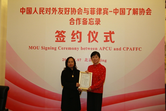 11月5日至9日,应我会邀请,菲律宾-中国了解协会(简称“菲中了解协会”)主席、菲众议员、前总统格洛丽亚·马卡帕加尔·阿罗约率团一行6人访问北京和广东。全国人大常委会副委员长向巴平措,中国东盟协会会长顾秀莲,中联部部长宋涛,全国对外友协会长李小林,外交学会会长吴海龙,广东省副省长许瑞生分别会见代表团。7日晚,在李小林会长和阿罗约主席的共同见证下,全国对外友协副会长林怡与菲中了解协会会长洛佩兹签署两会合作备忘录。
