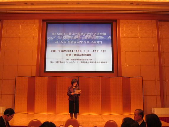 11月10日至11日,第十五届中日韩友好城市大会在日本富山县举行。全国友协副会长冯佐库、中日友好协会副会长王秀云、日本自治体国际化协会理事长木村阳子、韩国全国市道知事协议会事务总长李钟范以及中日韩三国地方政府和相关团体代表230人与会。