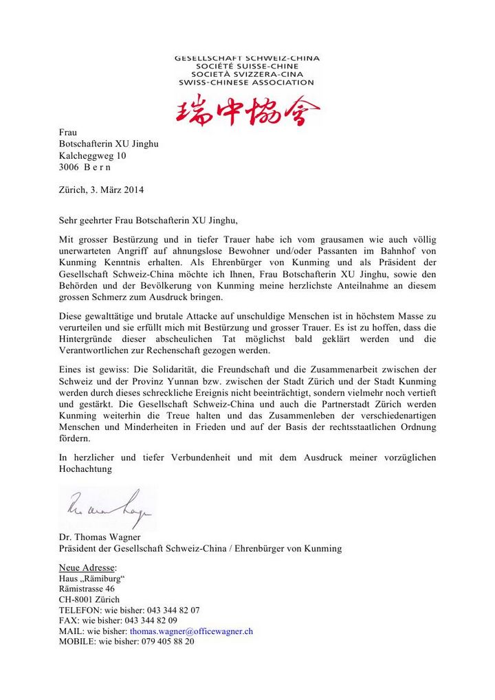 瑞中友协主席瓦格纳就昆明暴力恐怖事件致许镜湖大使的信