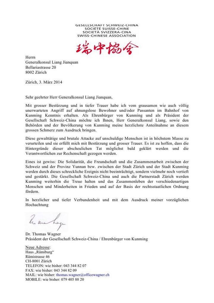 瑞中友协主席瓦格纳就昆明暴力恐怖事件致梁健全总领事的信