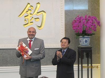 招待会上外交部副部长程国平代表中方向加姆克列利泽大使赠送了中国与格鲁吉亚双边关系重要文件汇编和建交20周年纪念画册。