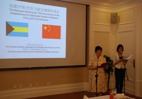 2012年6月7日,中国人民对外友好协会和中国-拉丁美洲和加勒比友好协会在友协西餐厅举办宴会庆祝中国-巴哈马建交15周年。中国人民对外友好协会会长李小林、中国驻巴哈马大使胡山、巴哈马驻华使馆代办谢拉·凯丽等嘉宾出席宴会。