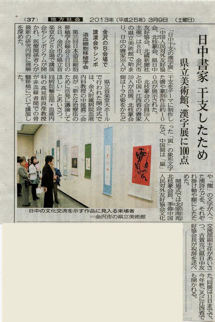 3月8日,由我会和日本石川县日中友好协会、北国新闻社、北枝篆会共同主办的《中日天干地支汉字文化书法篆刻展》在日本金泽市石川县立美术馆成功举办。我会李小林会长为展览致贺辞。