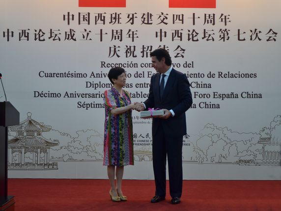 9月12日晚,中国人民对外友好协会隆重举行庆祝中国西班牙建交40周年招待会。全国人大常委会副委员长吉炳轩、全国人大常委会前副委员长、中西论坛中方主席乌云其木格、全国友协会长李小林、外交部副部长谢杭生、工信部副部长刘利华西班牙工业能源旅游大臣索里亚、中西论坛西方主席、前副首相索尔维斯、外交部第一副大臣贝尼托、驻华大使瓦伦西亚等出席。