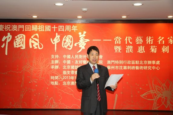 2013年12月20日我会户思社副会长在澳门特区驻京办事处出席了由我会友好艺术交流院和澳门特区驻京办事处联合主办的庆祝澳门回归14周年“中国风 中国梦”当代艺术名家“荷”主题展开幕式,并在开幕式上致辞。