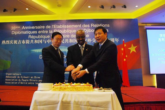 外交部部长助理钱洪山、全国友协副会长冯佐库与吉布提驻华大使阿卜杜拉·米吉勒共切蛋糕