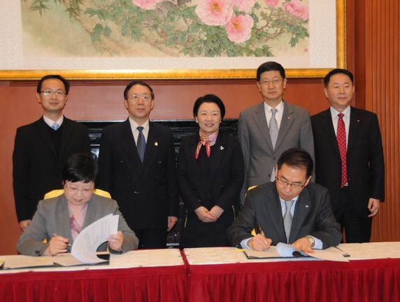 中国友好和平发展基金会副秘书长贾伶和希杰集团金成勋常务代表双方在捐赠协议上签字。