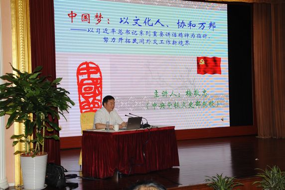 开班式后,中央党校梅敬忠教授以《中国梦:以文化人,协和万邦——以习近平总书记系列重要讲话精神为指针,努力开拓民间外交工作新境界》为题,为学员作了专题讲座。