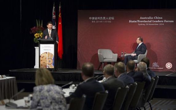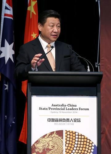 11月19日,国家主席习近平在悉尼与澳大利亚总理阿博特共同出席首届中澳省州负责人论坛。这是习近平在论坛上致辞。