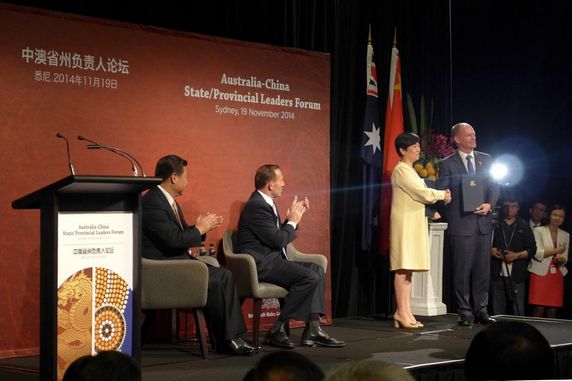 国家主席习近平19日在悉尼与澳大利亚总理阿博特共同出席了我会与澳大利亚新南威尔士州政府举办的首届中澳省州负责人论坛。