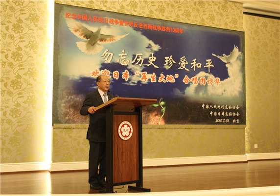 今年是中国人民抗日战争暨世界反法西斯战争胜利70周年。8月31日晚,中国人民对外友好协会和中日友好协会为到访北京举行首次正式公演的日本“再生大地”合唱团举行了主题为“勿忘历史,珍爱和平”的欢迎会。全国友协会长李小林、副会长宋敬武,全国友协日本部主任、中日友协副会长王秀云以及日中友好协会理事长田中义教、“再生大地”合唱团团长姬田光义等出席。