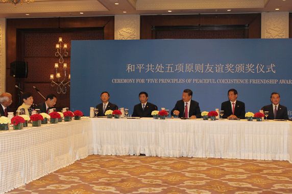 习近平向上述友好人士、友好团体颁发和平共处五项原则友谊奖对他们成为首批获奖者表示祝贺。习近平指出和平共处五项原则是中国、印度、缅甸老一辈领导人共同的智慧结晶成为重要的国际关系准则为推动建立公正合理的国际秩序发挥了重要作用。中方设立和平共处五项原则友谊奖就是要继承和弘扬五项原则推动建立平等互信、包容互鉴、合作共赢的新型国际关系。你们为传承和平共处五项原则精神发挥了表率作用。希望两国越来越多有识之士积极投入中印友好事业中来让中印友好理念在两国人民心中深深扎根、结出硕果。相信通过我们一代又一代人不懈努力中国和印度一定能够世世代代友好下去共同实现中印两大民族伟大复兴的梦想。