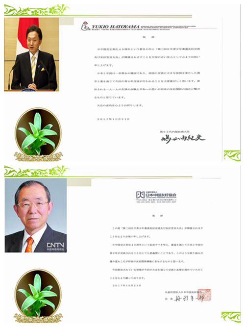 2017年10月21日,第二届中日青少年书法交流暨友好宣誓大会在中国人民对外友好协会隆重举行。日本前首相鸠山由纪夫、日本中国友好协会会长丹羽宇一郎特别为本届大会发来贺信。鸠山前首相在贺信中指出:汉字文化是在中日两国文化交流中占据重要位置,揭示了两国文化底蕴相近,理念相亲,两国青年通过相互切磋提高书法水平,为两国世代友好打下良好基础。丹羽会长则提到:今年恰逢中日建交45周年,通过书法交流这一务实举措对于增进中日友好大有裨益。中国人民对外友好协会秘书长李希奎、日本国驻华大使馆参赞福田高干出席大会并致辞。