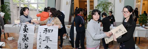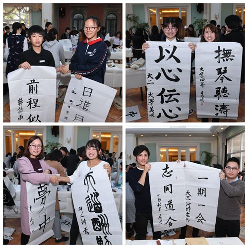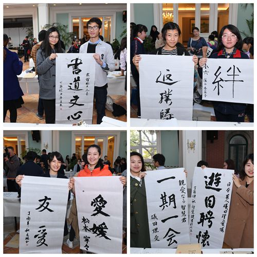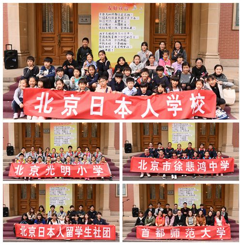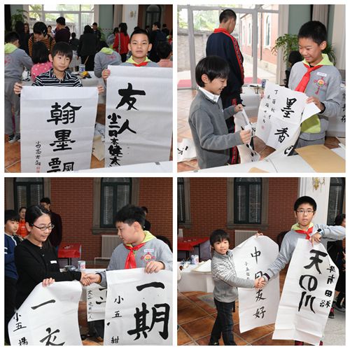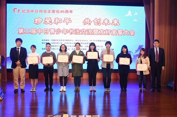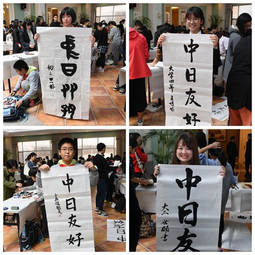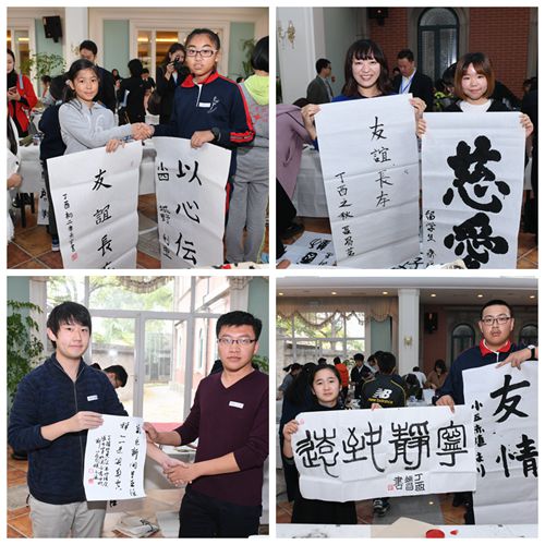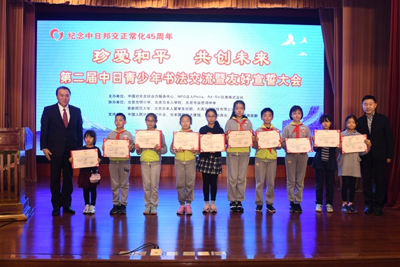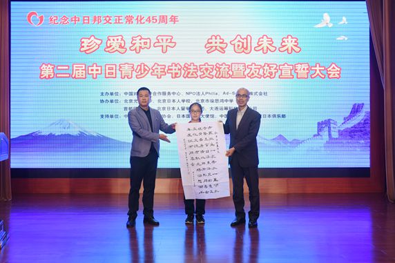 由北京光明小学、北京市徐悲鸿中学、首都师范大学和北京日本人学校、北京日本人留学生社团选送的100名中日青少年书法爱好者参加了书法交流暨友好宣誓大会。作为比赛作品学生们书写了“中日友好”四个字,表达了对两国友好的热切向往;通过每人书写一个字的形式,共同创作了百字“友好宣言”,还争先恐后地在友好宣言大幅红布上认真签字,倾注他们对中日世代友好的美好憧憬;还各自创作了“书道文心”、“游目聘怀”、“一期一会”、“美美与共”、“友谊长存”、“以心传心”、“志同道合”、“前程似锦”、“永远的朋友”等书法作品,互相赠送,抒发了由衷真挚的友好情感。