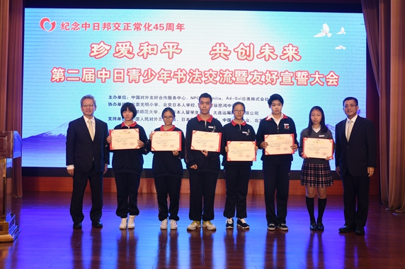 李希奎秘书长讲到:在中日邦交正常45周年之际,举办“第二届中日青少年书法交流暨友好宣誓大会”,具有更加现实和深远的意义。中日两国的一百名青少年通过书法交流、友好宣誓等活动形式,搭建起双方沟通和交流的平台,相互学习,共同提高,增进彼此的了解、信任和友谊,这是一次非常成功的友好交流盛会。