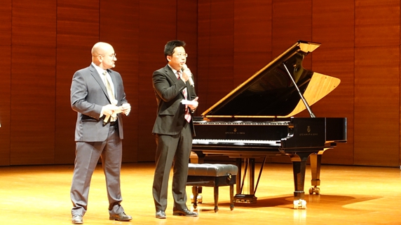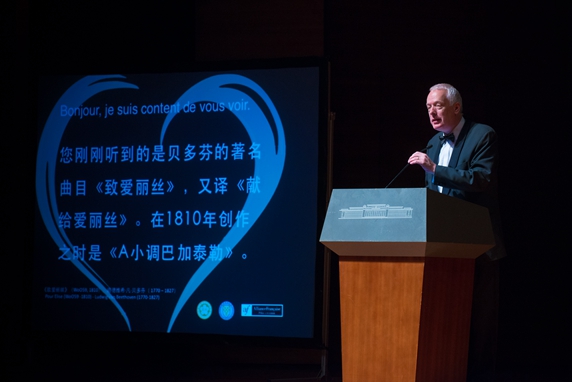 11月12日,由中国人民对外友好协会、北京法语联盟合办的“致爱情-我的心在你指间”钢琴独奏赏析音乐会在中国国家博物馆剧院隆重举行。我会文化交流部副主任季伟、法语联盟基金会驻中国及蒙古国总代表卢思和、北京语言大学校长刘利以及来自法国、比利时、越南、白俄罗斯、阿尔及利亚、突尼斯、印度尼西亚等近30位驻华外交官和近700名各界来宾、观众及新闻媒体记者出席了活动。季伟副主任、卢思和驻华总代表和刘利校长在音乐会上分别致辞。