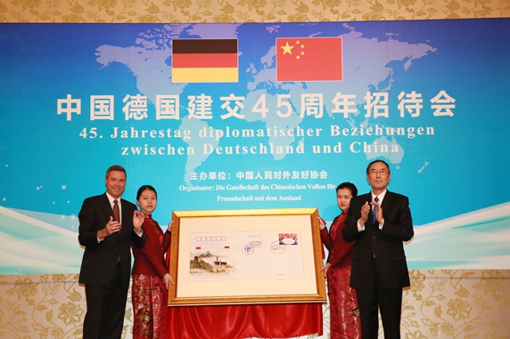 全国人大常委会副委员长向巴平措和德国驻华大使柯慕贤为中德建交45周年首日封揭幕