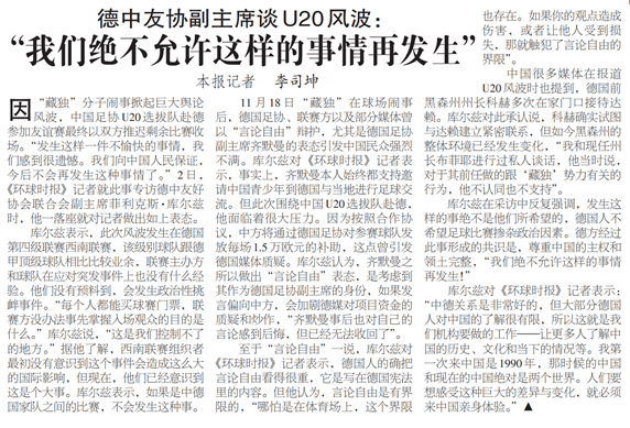 11月18日“藏独”在球场闹事后,德国足协、联赛方以及部分媒体曾以“言论自由”辩护,尤其是德国足协副主席齐默曼的表态引发中国民众强烈不满。库尔兹对《环球时报》记者表示,事实上,齐默曼本人始终都支持邀请中国青少年到德国与当地进行足球交流。但此次围绕中国U20选拔队赴德,他面临着很大压力。因为按照合作协议,中方将通过德国足协对参赛球队发放每场1.5万欧元的补助,这点曾引发德国媒体质疑。库尔兹认为,齐默曼之所以做出“言论自由”表态,是考虑到其作为德国足协副主席的身份,如果发言偏向中方,会加剧德媒对项目资金的质疑和炒作,“齐默曼事后也对自己的言论感到后悔,但已经无法收回了”。
