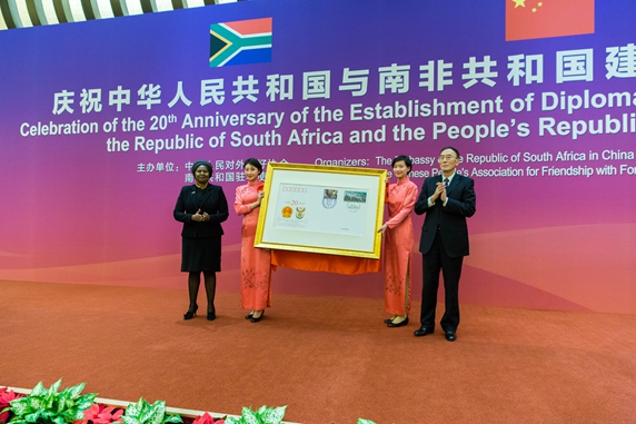全国人大常委会副委员长向巴平措与南非驻华大使多拉娜·姆西曼为两国建交20周年纪念封揭幕