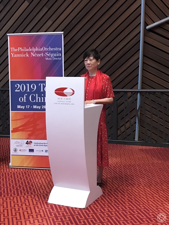 李会长在致辞中表示,欢迎费城交响乐团在中美建交40周年之际访华。音乐是无国界的语言,能够将来自不同国家、经历不同的人们紧密联结在一起,使人们更好地相互理解,平等相待,让世界变得更美好。