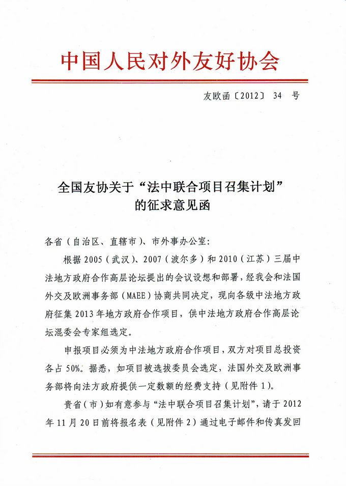 全国友协关于“法中联合项目召集计划”的征求意见函