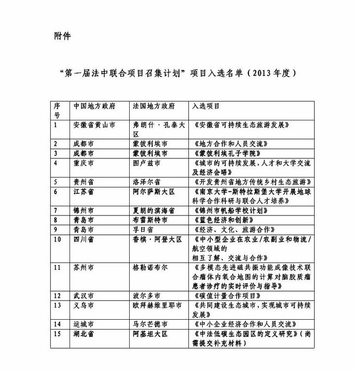 经过中法联合评审团的研究和审批,共有13个中方省市的15个项目符合要求,被选入“第一届法中项目联合召集计划”。