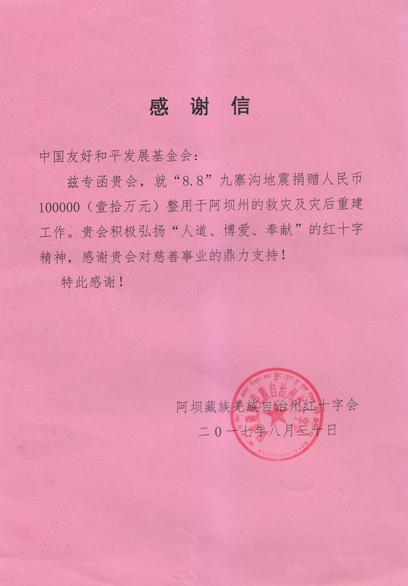 阿坝藏族羌族自治州红十字会向我会所属中国友好和平发展基金会致感谢信