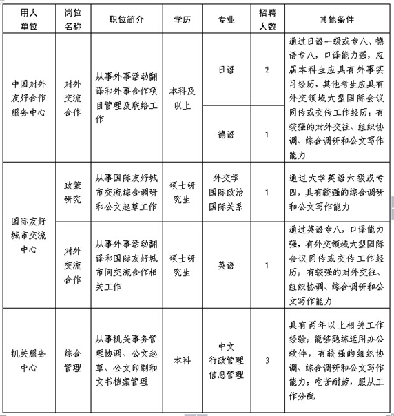 中国人民对外友好协会下属事业单位机关服务中心、中国对外友好合作服务中心、国际友好城市交流中心2015年拟公开招聘工作人员8名。机关服务中心承担我会机关内外事后勤服务工作和机关委托管理的部分行政事务性工作;中国对外友好合作服务中心为中外经济、人文交流提供咨询、中介服务并承担我会机关交办的工作;国际友好城市交流中心负责国际友好城市经济文化等领域的交流活动、民间外交战略研究、培训等,并承担我会机关交办的工作。拟招聘岗位均为事业单位正式工作人员岗位,福利待遇按照国家有关规定执行。现将有关事项公告如下: