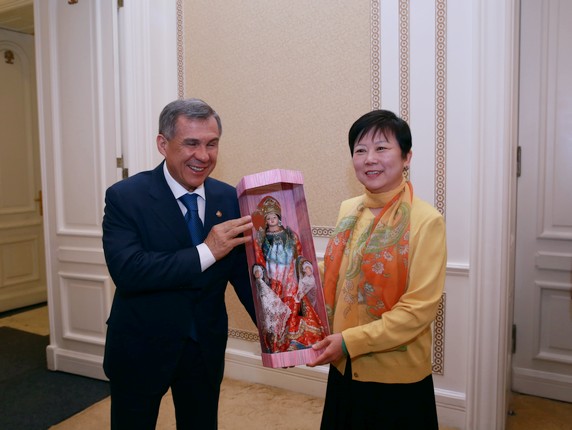 President Li Xiaolin extended her warm welcome to President Minnikhanov, and briefed him about the basic status and friendship cause with Russia of CPAFFC. She emphasized that, in recent years, the national leaders of the both countries paid great attention to the cooperation in cultural and local exchange. At the same time as CPAFFC has achieved fruitful result in above aspects, it would continuously support and assist The Republic of Tatarstan and other regions in Russia to develop pragmatic cooperations with China, so as to make active efforts for China-Russia strategic and collaborative partnership. President Li warmly invited President Minnikhanov to attend the First Dialogue for Chinese and Russian Governors upcoming in this year.