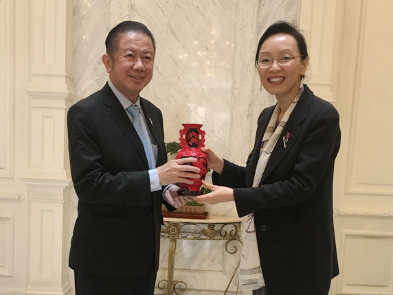 Vice President Lin appreciated the efforts Chen Shuqing, Hong Baichuan and her family members had made for a long time on promoting the people-to-people exchanges between China and Thailand. Vice President Lin also spoke highly of the Thai high-level entrepreneurs learning Chinese language and culture, and devoting to the cause of Thai-Chinese friendship. She said that the future for the two countries to cooperate in various fields is broad, especially in economy, trade and humanity. CPAFFC would like to establish cooperative mechanism with the Bangkok College of BLCU to push forward the exchanges in the sectors mentioned above between the two countries.