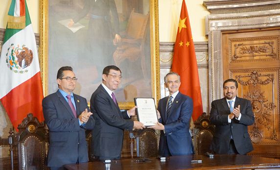 During in Mexico, Vice Chairman Ma Peihua met respectively with Mme. Gloria Himelda Felix Niebla, the first Vice President of the Chamber of Deputies, Mr. Rolando Rodrigo Zapata Bello, Governor of Yucatan state. Mr. Miguel Angel Mancera, Mayor of Mexico City, awarded “Distinguished Visitor” medal to Vice Chairman Ma Peihua and Ma delivered a speech in the city hall of Mexico city. Moreover, Vice Chairman Ma Peihua also met with Mr. Graco Luis Ramirez Garrido Abreu, Governor of Morelos, Mr. Marco Antonio Mena Rodriguez, Governor of Tlaxcala and Mr. Jose Rosas Aispuro Torres, Governor of Durango, who paid a special visit to Mexico City to meet the delegation.