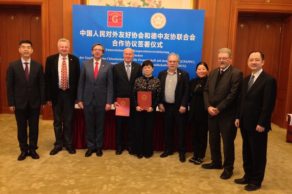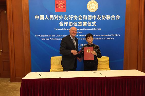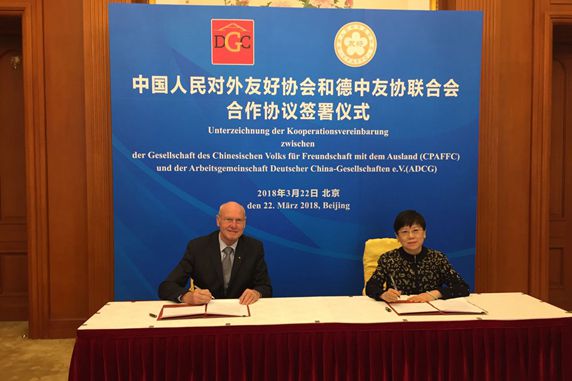 Mme. Li Xiaolin, President of the Chinese People’s Association for Friendship with Foreign Countries (CPAFFC), met with Federation of German-China Friendship Association (FGCFA) presidents delegation, and signed cooperation agreement between CPAFFC and FGCFA with Mr. Kurt Karst, President of FGCFA on March, 22nd.