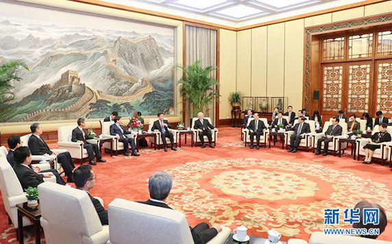 Li Zhanshu, Chairman of the NPC Standing Committee, meets with the delegation of Japan-China Friendship Parliamentarians' union led by Hayashi Yoshimasa, at the Great Hall of the People in Beijing, on May 3, 2018. (Xinhua/Pang Xinglei)