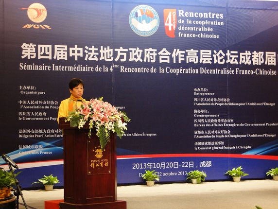 The fourth mid-session of High-Level China-France on Local Government Cooperation with the theme of Innovative Development of Cities was jointly held by CPAFFC, Sichuan Provincial People’s Government, National Commission for Decentralized Cooperation of French Ministry of Foreign Affairs and French League of Cities in Chengdu, China on 21th October, 2013.
