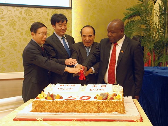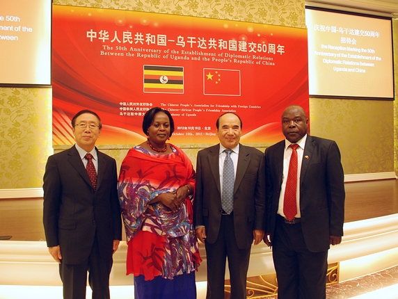Jointly organized by the Chinese People’s Association For Friendship with Foreign Countries(CPAFFC), the Chinese and African People’s Friendship Association(CAPFA) and the Uganda Embassy, the reception celebrating the 50th Anniversary of the Diplomatic Relations between Uganda and China was held in Beijing on October 18th, 2012. Vice President of Uganda, Edward Ssekandi , sent his video congratulatory message to the reception. H.E. Mr.Abdul’ahat Abdurixit,Vice Chairman of Chinese People’s Political Consultative Conference(CPPCC) and President of CAPFA, Mr. Zhai Jun, Vice Minister of Chinese Foreign Ministry attended the reception. Mr. Feng Zuoku, Vice President of CPAFFC and Mr.Wagidoso, Ambassador of Uganda delivered the speech at the reception respectively.
