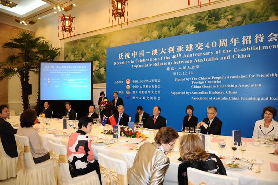 On Dec. 14th, 2012, the Chinese People’s Association for Friendship with Foreign Countries (CPAFFC) and China-Oceania Friendship Association held a reception in the Great Hall of the People to celebrate the 40th anniversary of the establishment of diplomatic relations between China and Australia. Around 150 guests have attended the reception, including: Mr. Isma’il Tiliwaldi, Vice Chairman of National People’s Congress, Representatives from Ministry of Foreign Affairs, State-owned Assets Supervision and Administration Commission, Ministry of Education, International Department of Central Committee of CPC, Ministry of Environmental Protection, Ministry of Commerce and Ministry of Culture, former Chinese ambassador to Australia, Minister of Regional Development and Arts delegation, Australian ambassador to China and diplomats from New Zealand, Fiji, Vanuatu, Tonga, Samoa and Micronesia, representatives from Pacific Islands Forum, and Australian guests of all walks of life in Bejing. In the speeches of Madam Li Xiaolin, President of the CPAFFC and Hon. Mr. Simon Crean, Minister of Regional Development and Arts, both have spoken highly of the rapid progress Sino-Australian relations have made during the past 40 years and expected the deepening and innovative cooperation for the next 40 years.
