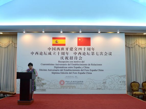In the evening of Sept. 12th, a reception celebrating 40th anniversary of establishment of China-Spain diplomatic relations was held in the CPAFFC. Mr. Ji Bingxuan, Vice Chairman of the Standing Committee of the National People''s Congress (NPC), Mme. Uyunqimg, the former Vice Chairperson of the Standing Committee of NPC and the Chinese Chairperson of China-Spain Forum, Mme. Li Xiaolin, the president of the CPAFFC, Mr. Xie Hangsheng, the vice foreign minister of China, Mr. Liu lihua, the vice minister of Ministry of Industry and Information Technology of China, Mr. Jose Manuel Soria, the Spanish minister of industry, energy and tourism, Mr. Pedro Solbes Mira, the Spanish Chairman of China-Spain Forum and former vice prime minister of Spain, Mr. Gonzalo De Benito Secades, the first vice foreign minister of Spain and Mr. Manuel Valencia Alonso, the Spanish Ambassador to China were present.
