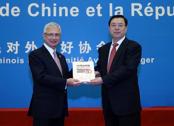 In his address, Zhang Dejiang said, on the same date 50 years ago, the Chinese and French governments declared the establishment of the diplomatic relations at ambassadorial level of the two countries. This great important historical event is a mile stone in the history of the contact between the Chinese and French people. The establishment of China-France diplomatic ties initiated a new era for the friendly relation of the two great countries, and set a new model of peaceful coexistence for countries with different social systems, as well as produced profound and far-reaching influence to the international strategic pattern.