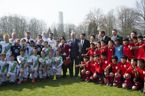 During President Xi Jinping’s visit to Germany, Mme. Li Xiaolin, President of the Chinese People’s Association for Friendship with Foreign Countries (a.k.a. CPAFFC) led Rainbow Bridge-Volkswagen Youth Football Team to Germany for exchange during March 26 to 30, 2014. The opening ceremony of “Pursue Chinese Youth’s Football Dream” China-Germany Junior Football Training Camp and a friendly match was held in Wolfsburg. President Xi Jinping and his wife Peng Liyuan, Cai Zhenhua, deputy director of the State General Administration of Sport of China and Chairman of Chinese Football Association, who made a special trip for this event, Mme. Li Xiaolin, President of the CPAFFC, Martin Winterkorn, Chairman and CEO of Volkswagen AG, Grindal, Representative of German Football Association (DFB) attended the event.
