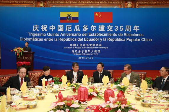On Jan. 6th, 2015, the CPAFFC hosted a banquet for celebrating the 35th anniversary of the establishment of diplomatic relations between China and Ecuador. Zhang Baowen, Vice-Chairperson of The National People''s Congress (NPC) of the People''s Republic of China, Rafael Correa, President of the Republic of Ecuador, Li Xiaolin, President of the CPAFFC, Qian Hongshan, Assistant Minister of Foreign Ministry of China were present at the banquet.