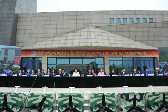 On March 28, Chinese Vice Premier Liu Yandong attended and launched the opening of the Flying Tiger Guilin Heritage Park in Guilin, southwest China’s Guangxi Zhuang Autonomous Region. Over 300 Chinese and American guests attended the ceremony, including Secretary Peng Qinghua of CPC Guangxi Zhuang Autonomous Region Committee, Deputy Secretary General Jiang Xiaojuan of the State Council, Vice Minister Lu Xin of Education, Vice Minister Chen Gaihu of the State Ethnic Affairs Commission, Vice Minister Tan Tianxing of the State Council Overseas Chinese Affairs Office, Assistant Foreign Minister Zheng Zeguang, CPAFFC Vice President Xie Yuan, Secretary Zhao Leqin of CPC Guilin Municipal Committee, Mayor Zhou Jiabin of Guilin, Chairman James Whitehead of the American Flying Tigers Historical Organization (FTHO) and Honorary President Florence Fang of FTHO, US Consul General Jennifer Galt in Guangzhou, Air Attaché Michael Marble of the US Embassy in China, 91-year-old Flying Tiger veteran JV Vinyard, Cynthia Chennault, daughter of General Chennault and Nell Calloway, granddaughter of General Chennault.