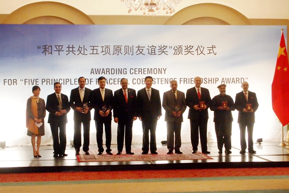The Awarding Ceremony of “Five Principles of Peaceful Coexistence Friendship Award” was held in Islamabad, Pakistan on April 20, 2015. Visiting Chinese President Xi Jinping and Pakistani President Mamnoon Hussain attended the awarding ceremony. CPAFFC President Li Xiaolin presided over the ceremony. President Xi Jinping conferred the Five Principles of Peaceful Coexistence Friendship Award on the following groups and individuals for their long-term commitment to China-Pakistan friendship. They are All Pakistan China Friendship Association, the National University of Modern Languages, the National Management College and Earthquake Medical Relief Mission China-2008. Mushahid Hussain Sayed, Ali Ahmad Jan and Masood Khan were also granted the award.