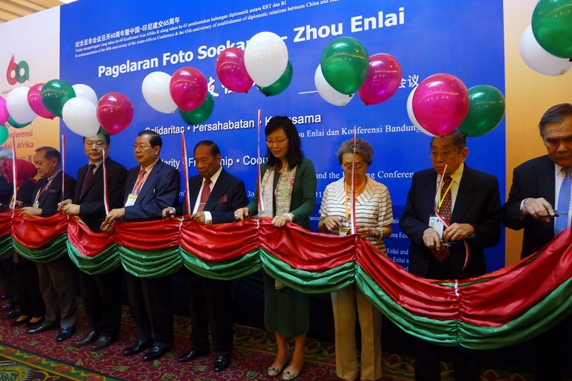 The Exhibition was held along side with other activities in memory of the 65th anniversary of China-Indonesia diplomatic relations and the 60th anniversary of the Bandung Conference (Asia-Africa Conference). At the opening ceremony, VIPs from China and Indonesia cut the ribbon and toured the exhibition together. Ms. Lin Yi, Ms. Zhou Bingde, Mr. Sukamdani S. Gitosardjono and Mr. Huang Shuhai, who was the Indonesian language interpreter of Zhou Enlai, delivered speeches respectively. Mr. Jin Hongyue, Counselor of the Chinese Embassy in Jakarta also attended the opening ceremony.