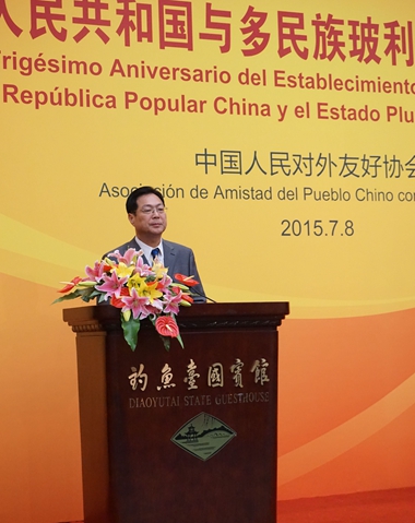 On July 8th, the CPAFFC held a banquet marking the 30th anniversary of the establishment of diplomatic relations between China and Bolivia in Diao Yutai State Guesthouse. Mr. Wang Chao, Vice Minister of Foreign Affairs, Mr. Xie Yuan, Vice President of CPAFFC and H.E. Mr. Guillermo Chalup, Ambassador of Bolivia to China attended the banquet.