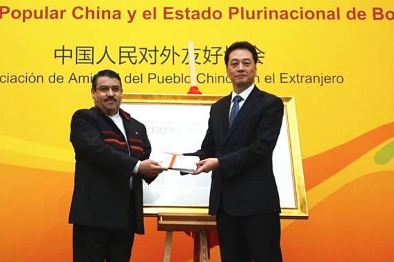 On the occasion, Mr. Wang Chao and H.E. Ambassador Chalup unveiled the first-day cover marking the celebration of the 30th Anniversary of the Establishment of Diplomatic Relations between China and Bolivia.