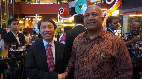 During the reception, CPAFFC Vice President Hu Sishe had a cordial talk with Prime Minister Josaia Voreqe Bainimarama and conveyed that our association would like to enhance the friendly relations with Fiji through people-to-people contacts coupled with the celebration of the 40th anniversary of the establishment of the diplomatic relationship between the Republic of Fiji and China. Prime Minister Josaia Voreqe Bainimarama expressed his expectation to further the cooperation in various fields between our two countries .