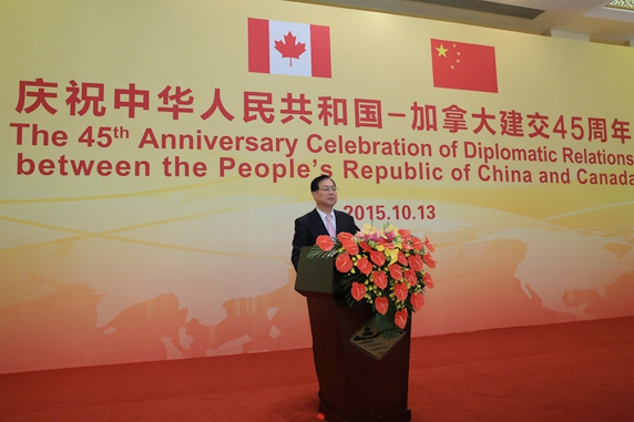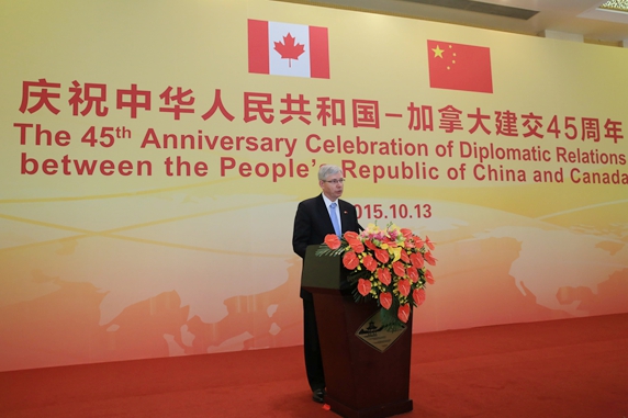 His Excellency Mr. Guy Saint-Jacques, Ambassador of Canada to China addressing the reception for the 45 anniversary of the establishment of diplomatic relations between China and Canada