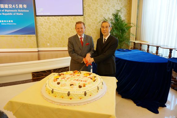 On the reception, Vice Chairman Ma Biao and Ambassador John Aquilina attended the unveiling ceremony of commemorative envelop for the 45th anniversary of diplomatic relations between China and Malta and jointly cut the cake for the 45th anniversary of diplomatic ties.