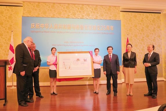 Vice President Lin Yi and Vice-Minister Jalaghania delivered speeches respectively. Vice Chairman Wang Zhengwei and Vice-Minister Jalaghania jointly unveiled the plaque for the commemorative envelop marking the 25th anniversary of the establishment of China-Georgia diplomatic relations.